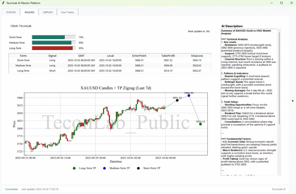 Hourly Signals: Every hour, the platform evaluates market conditions across XAUUSD, EURUSD, and GBPUSD using thousands of specialized AI models. For each symbol, it provides short-term, medium-term, and long-term forecasts, helping traders stay aligned with the most relevant trends.